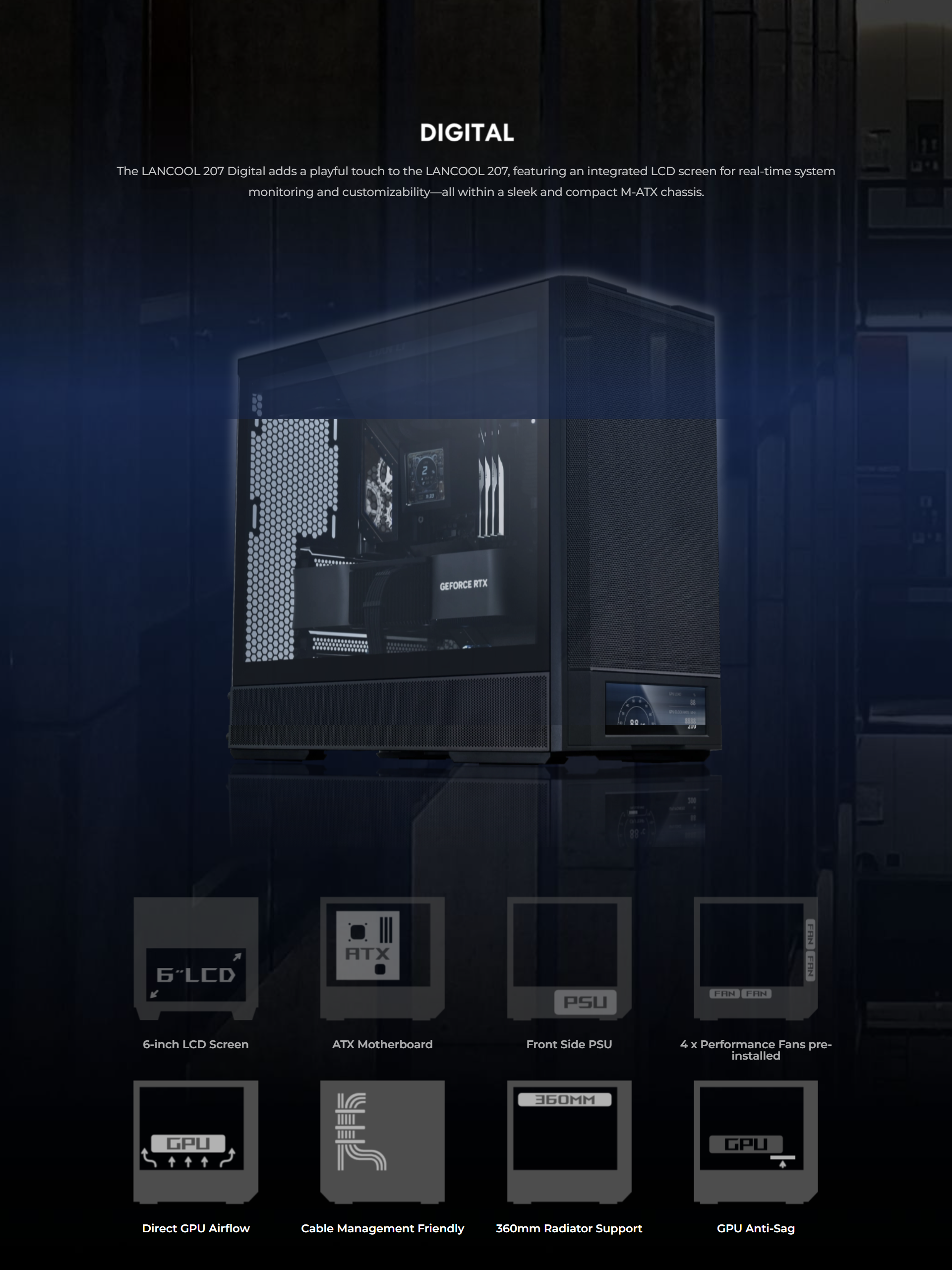 صُمِّم Lian Li Lancool 207 Digital ليجمع بين التصميم العصري والأداء الراقي، مع شاشة LCD بقياس 6 إنش تنبض بالحياة بدقة 720×1600 مع تحديث 60 Hz وسط زجاج قوي من النوع المقسّى والصلب. إنه الهيكل المثالي لبناء حاسوب متكامل بأداء عالي وأناقة لا تُضاهى.
