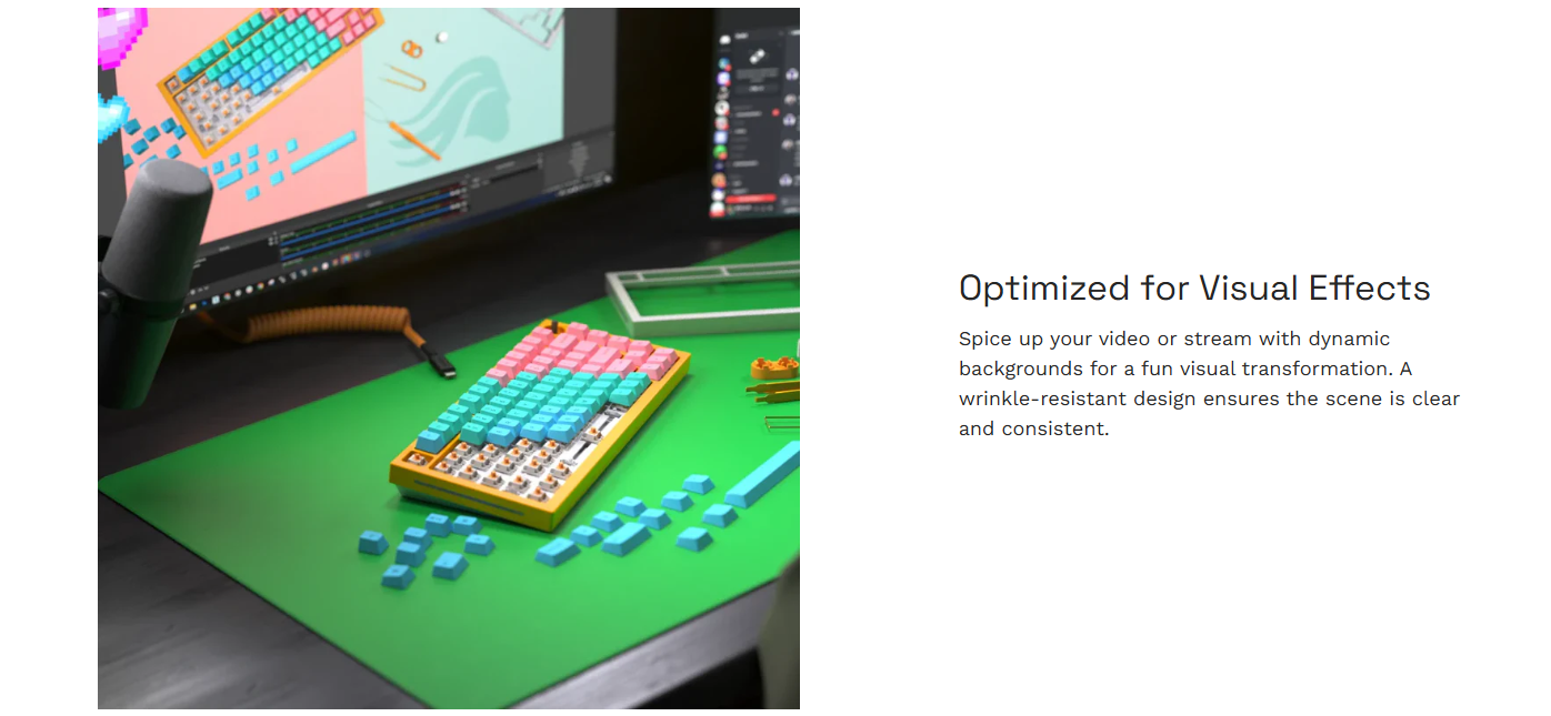 تخيل أن لوحة الماوس لديك تتحول إلى شاشة خضراء حيّة تتيح لك استبدال الخلفية في البث المباشر بسهولة — هذا بالضبط ما يفعله Glorious Chroma Key Mousepad! إنها ليست فقط قطعة مخصصة لوضع الماوس، بل أداة إبداعية لمحترفي البث والإنتاج المرئي تجعل كل حركة للماوس تظهر وكأنها عائمة في الفضاء الرقمي. مثالية لمن يستخدم OBS أو Twitch Studio أو أي برنامج بث لابتكار مؤثرات بصريّة مميزة.
