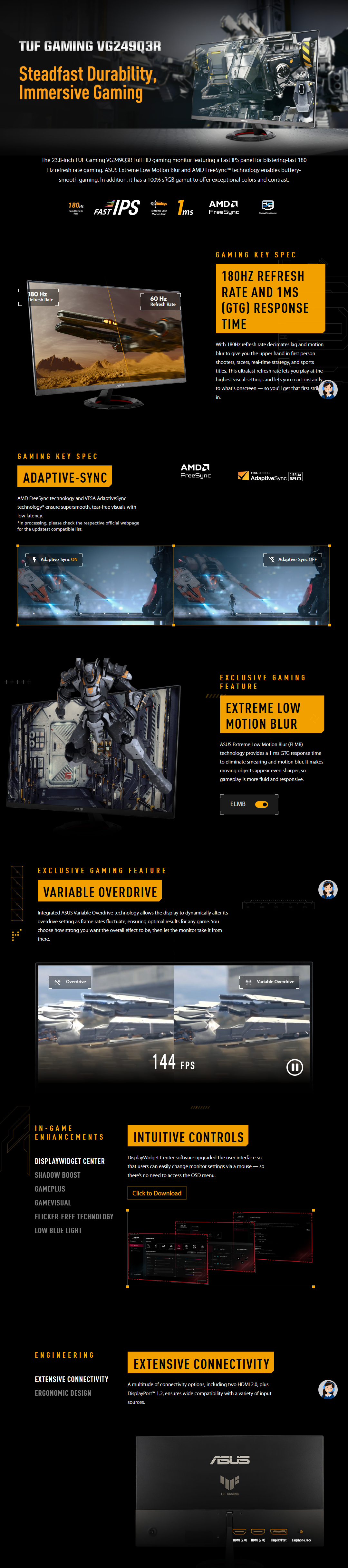 - Product Name: ASUS TUF Gaming VG249Q3R Gaming Monitor - 24" Full HD (1920x1080), 180Hz, Fast IPS, Extreme Low Motion Blur™, 1ms (GTG), FreeSync™, Variable Overdrive, 100% sRGB - Black